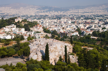 view of tourists on Areopagus hill from Filopappos-Philopappos hill on background dwelling of city Athens, Greece
