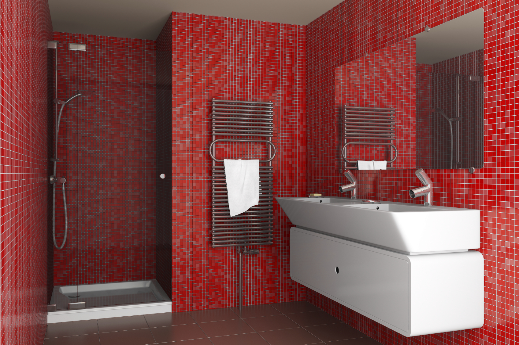 modern bathroom with red mosaic tiles on wall
