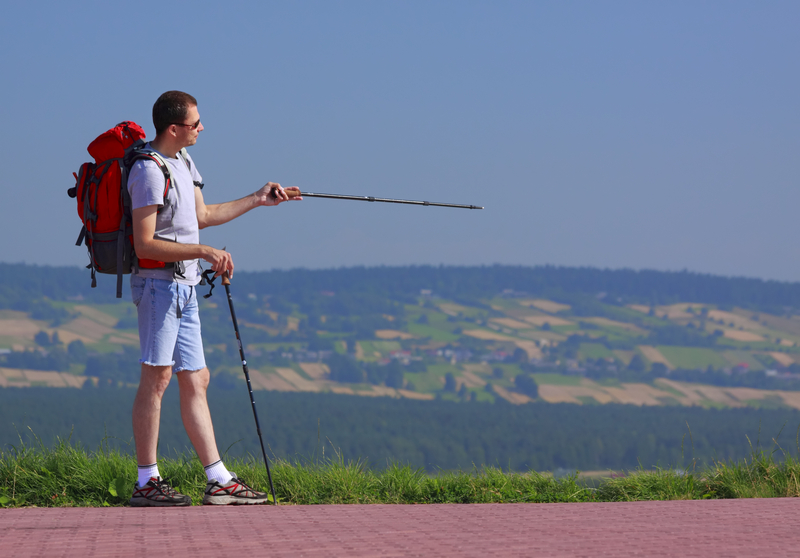 Standing tourist with backpack and trekking sticks over unfocused background