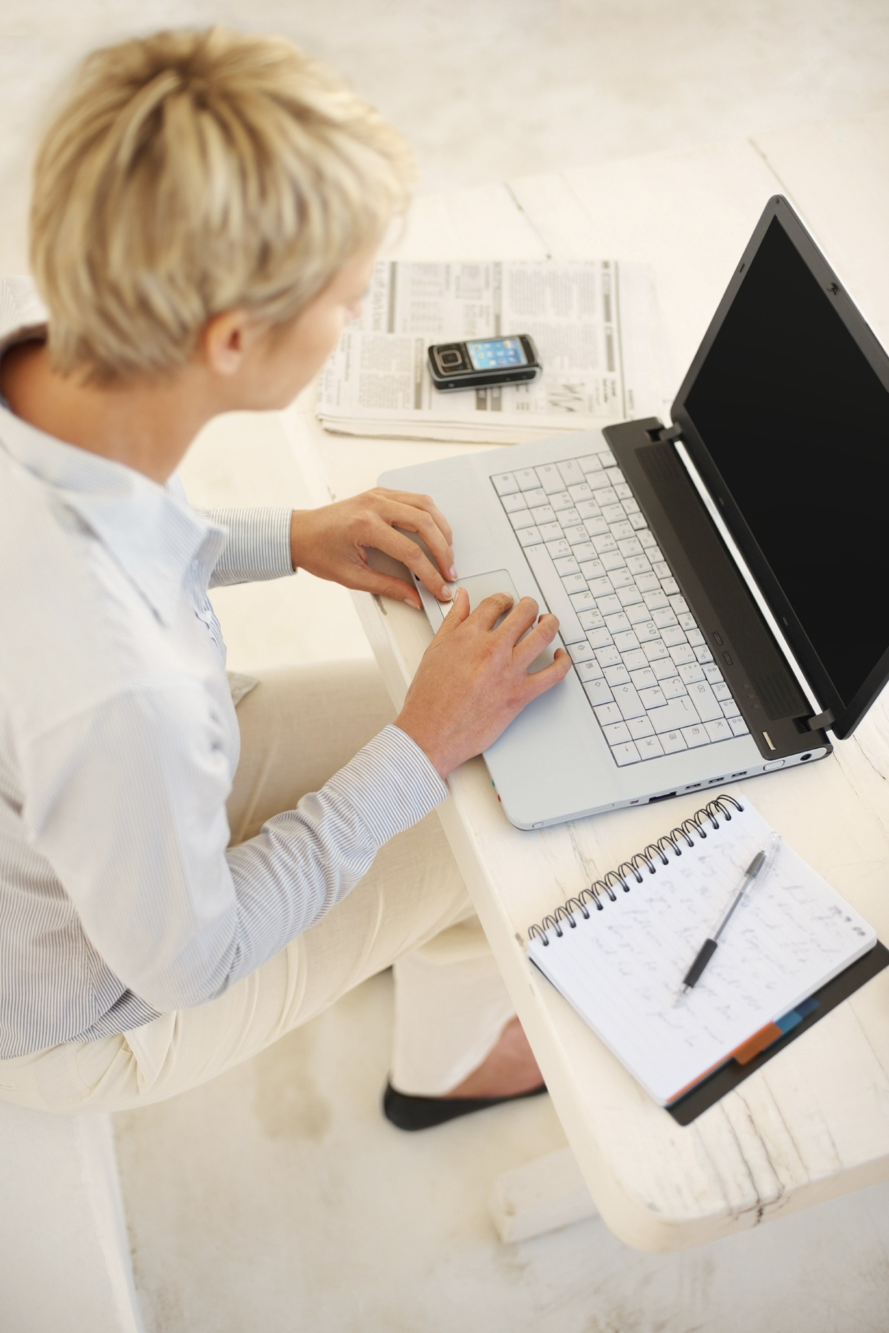 Top view of a business woman working online , focus on laptop