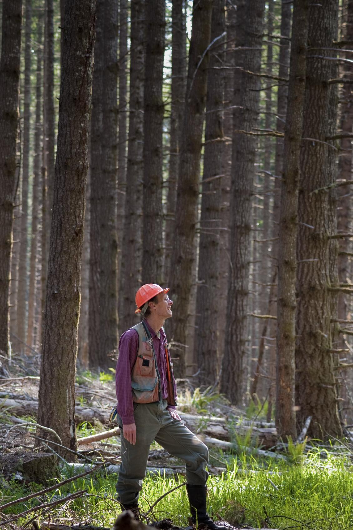 Forester standing among Douglas fir trees in the Pacific Northwest