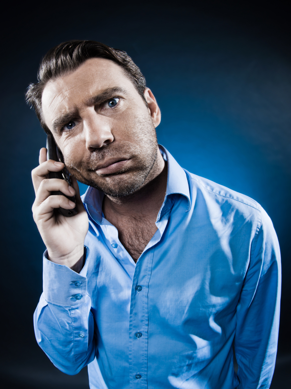 caucasian man frown bored at phone unshaven portrait isolated studio on black background