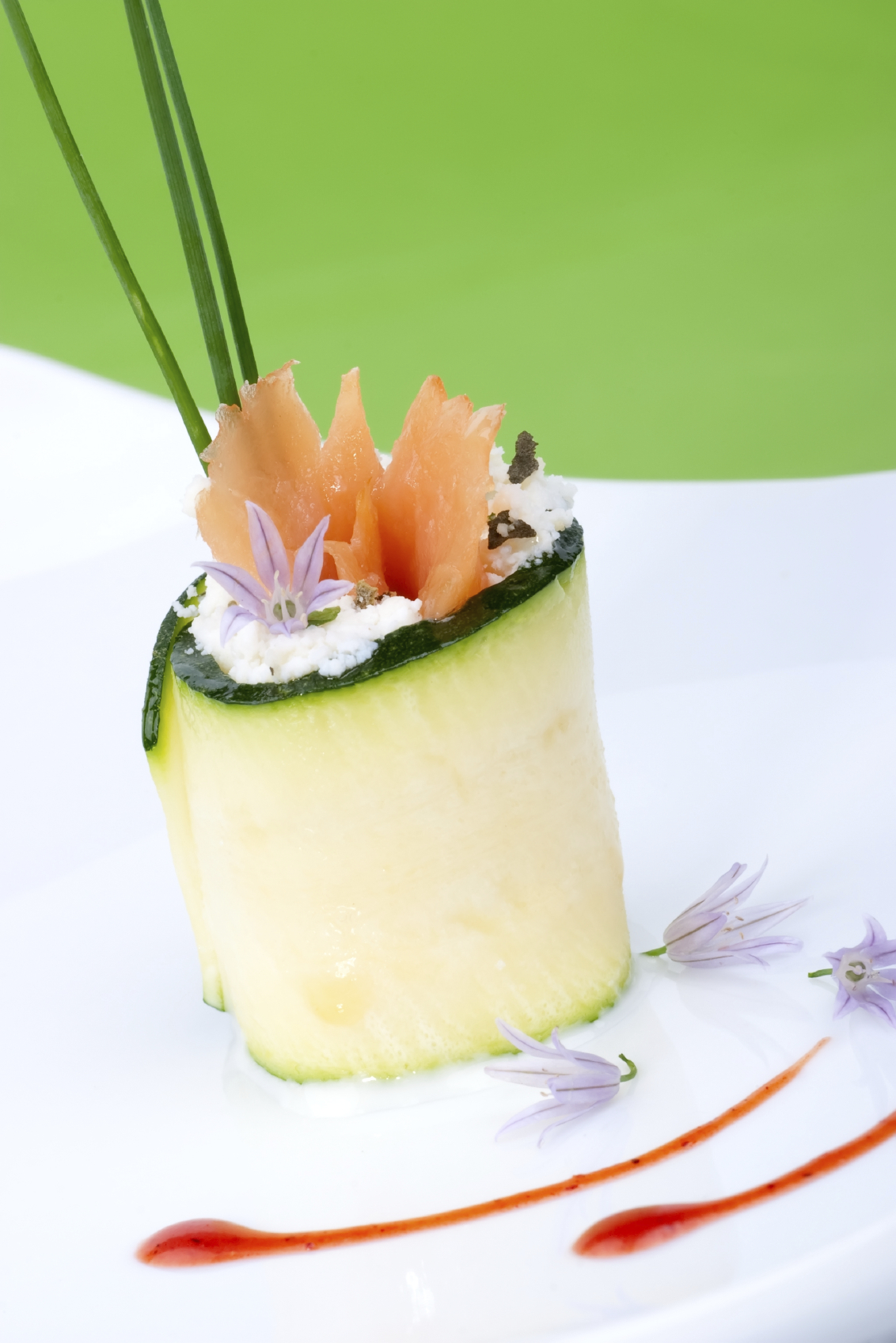 Zucchini Roll with shrimps and seasoned capelin roe (Masago). Garnished with wasabi sauce.