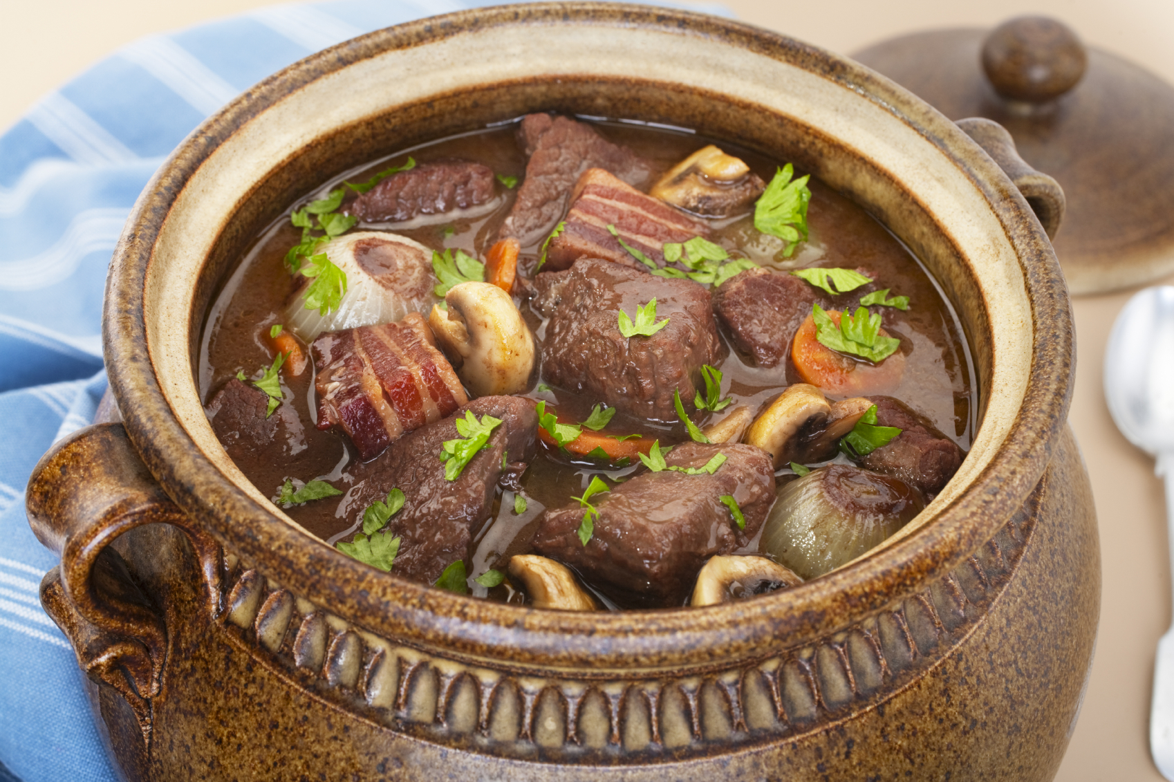 Description: Classic beef bourguignon in a traditional brown pot. Contains beef, lardons, mushrooms, onions, carrots, garlic, red wine, stock, parsley,thyme, bay leaf.