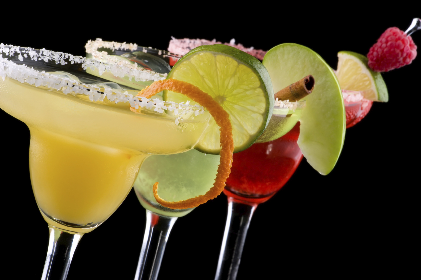 Three Margaritas - apple, orange and raspberry - in chilled glasses over black background, garnished with slice of green apple, limes, orange twist, raspberry and cinnamon stick. Most popular cocktails series.