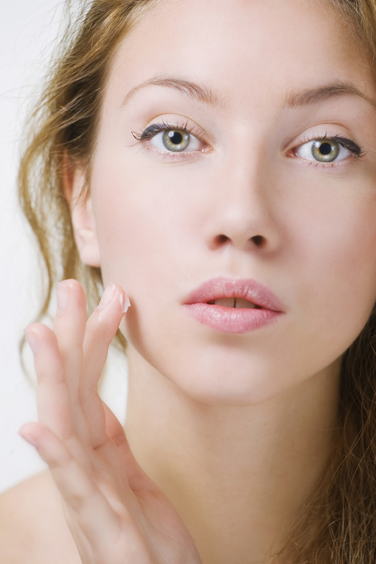 Close-up of beautiful woman face, applying moisturizer