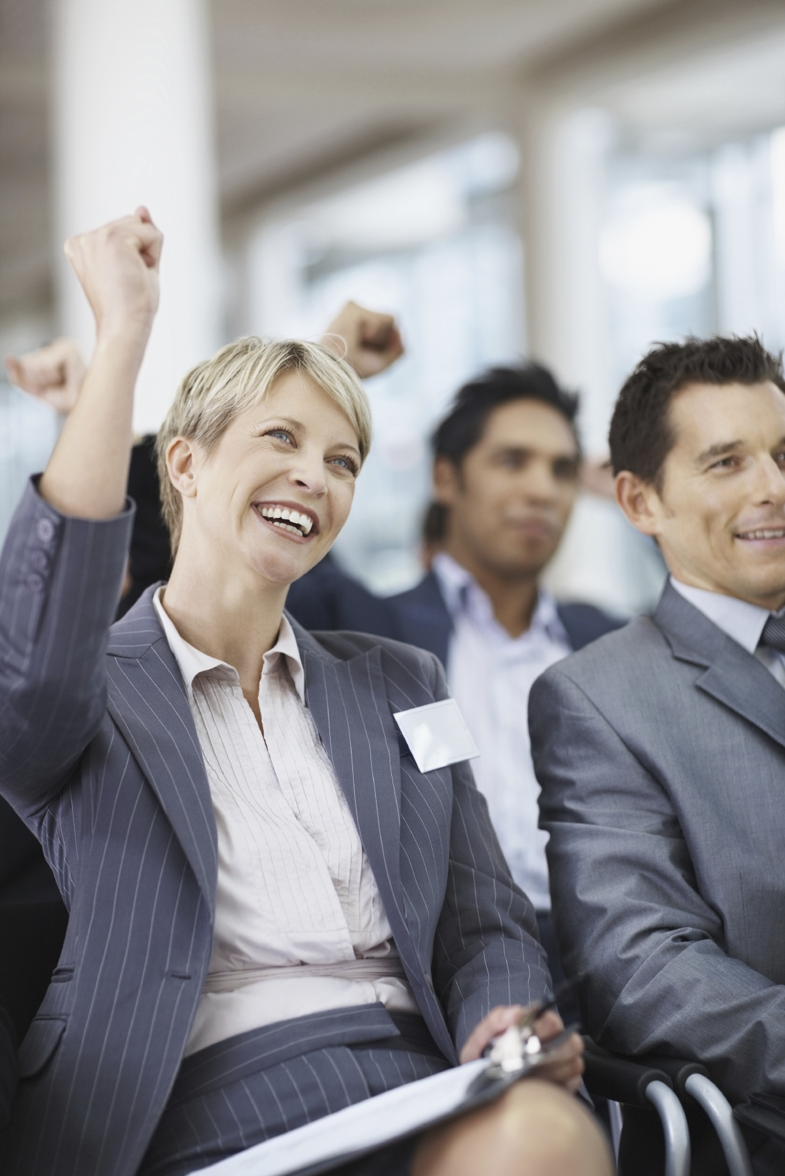 Happy group of business colleagues at a conference with a positive gesture