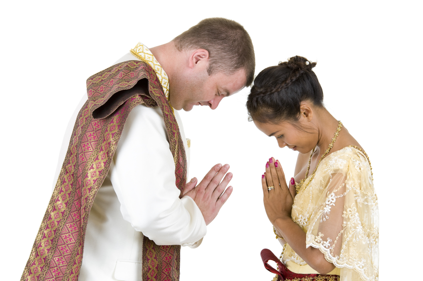happily married couple in traditional thai wedding clothes, isolated on white background