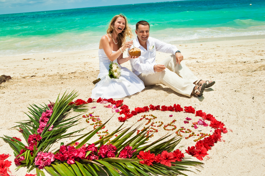 Wedding couple in Caribbean beach, happy, laughing and drinking coconut
