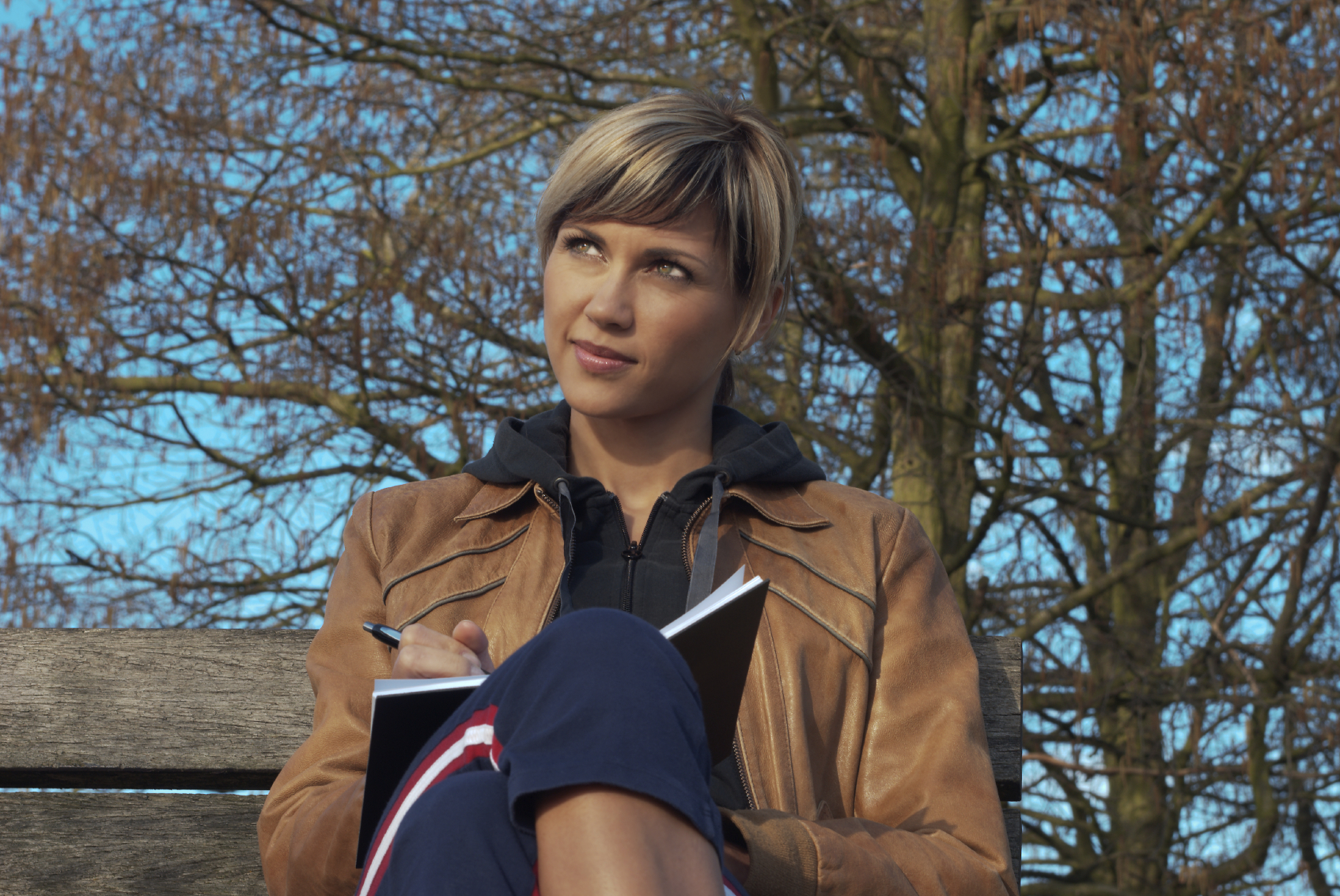Woman writing on a bench in a park.
