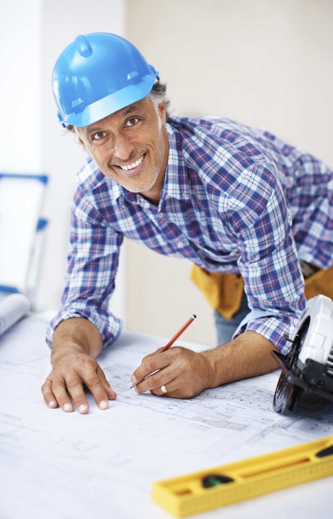 Portrait smiling architect working on blue print