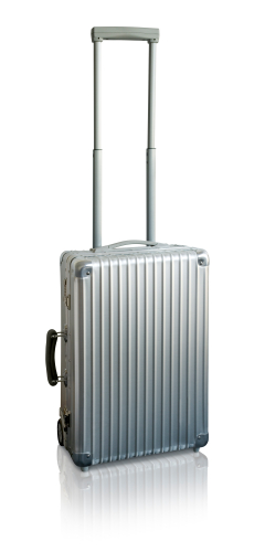 A classic metal suitcase with stylish aluminium body and a leather handle. Isolated on shiny white surface. Just waiting to roll it's way to the business class. PLEASE NOTE: COMPOSITED OF TWO EXPOSURES FOR UPPER AND LOWER PART OF THE IMAGE, NOT UPSCALED.