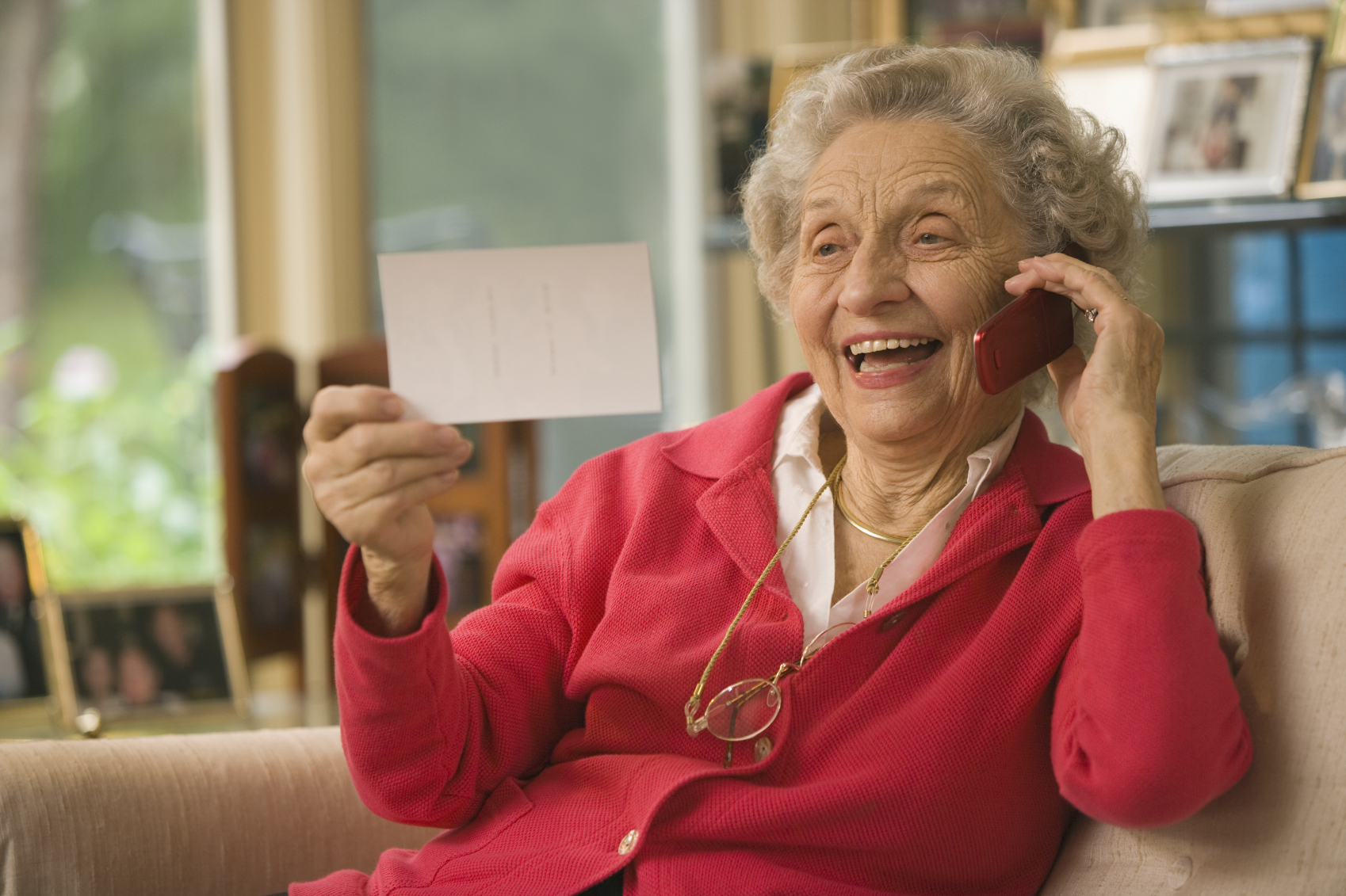 Happy senior woman holding photo and cell phone