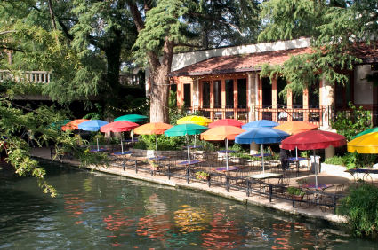 Umbrellas in the morning sun on the San Antonio Riverwalk