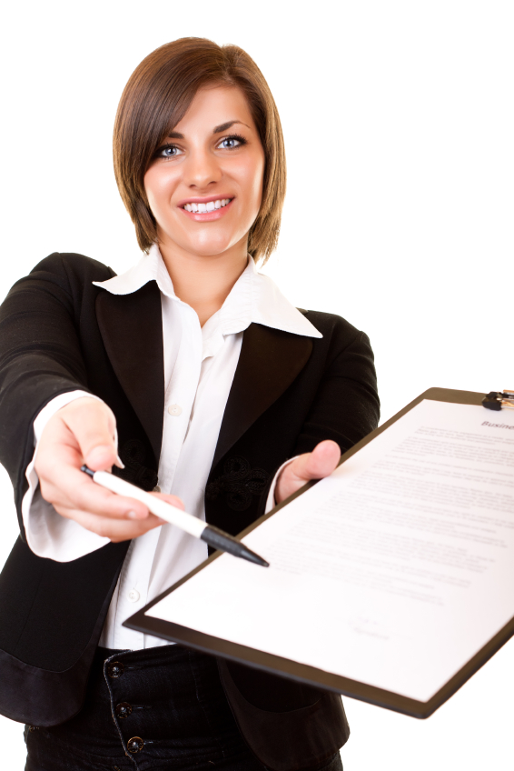 young businesswoman giving contract for you to sign