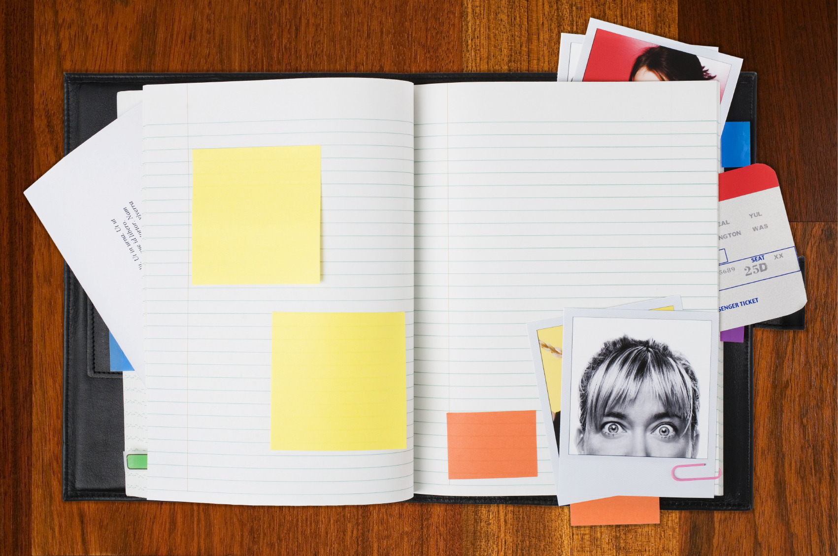Opened book with blank post-it, polaroids, boarding pass laying over red warm wood . Note that all material (images, boarding pass; document were created by us. Colored background