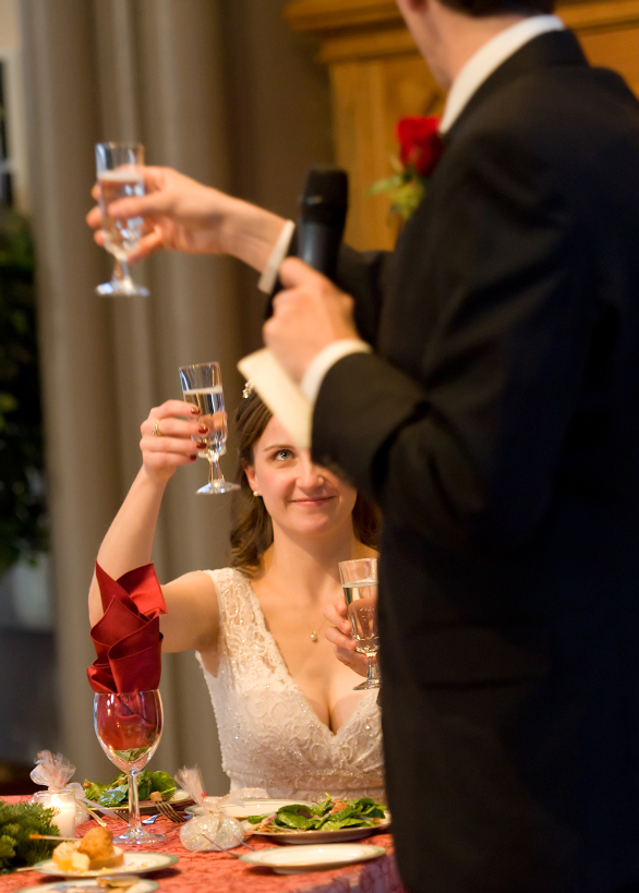 Bride raising a glass, and framed by the arm of a speaker at her wedding who is giving a toast and also raising a glass. Shallow DOF with selective focus on the bride.