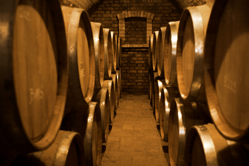 Wine barrels stacked in the old cellar of the winery.