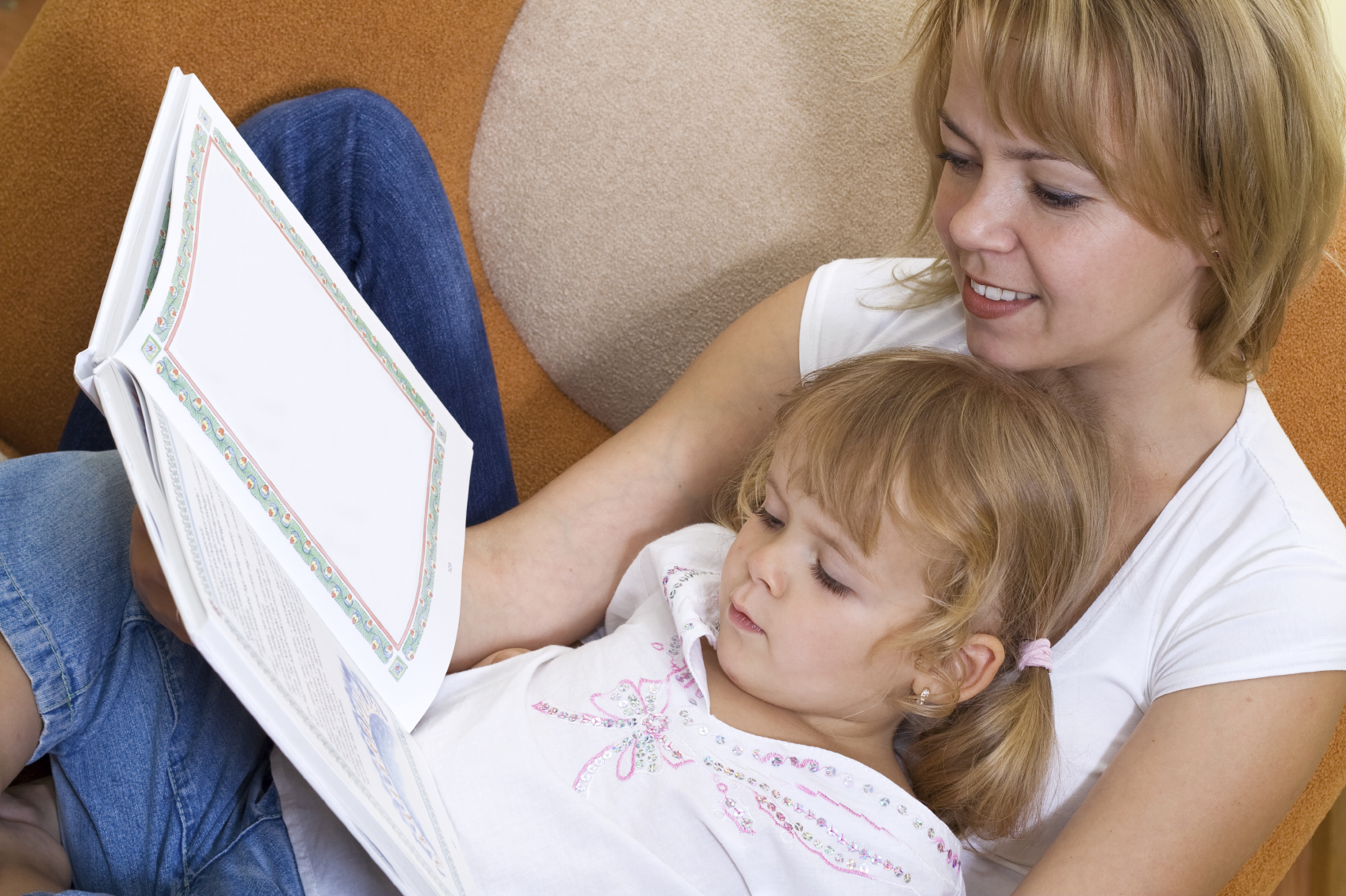 Woman and little girl story time at home