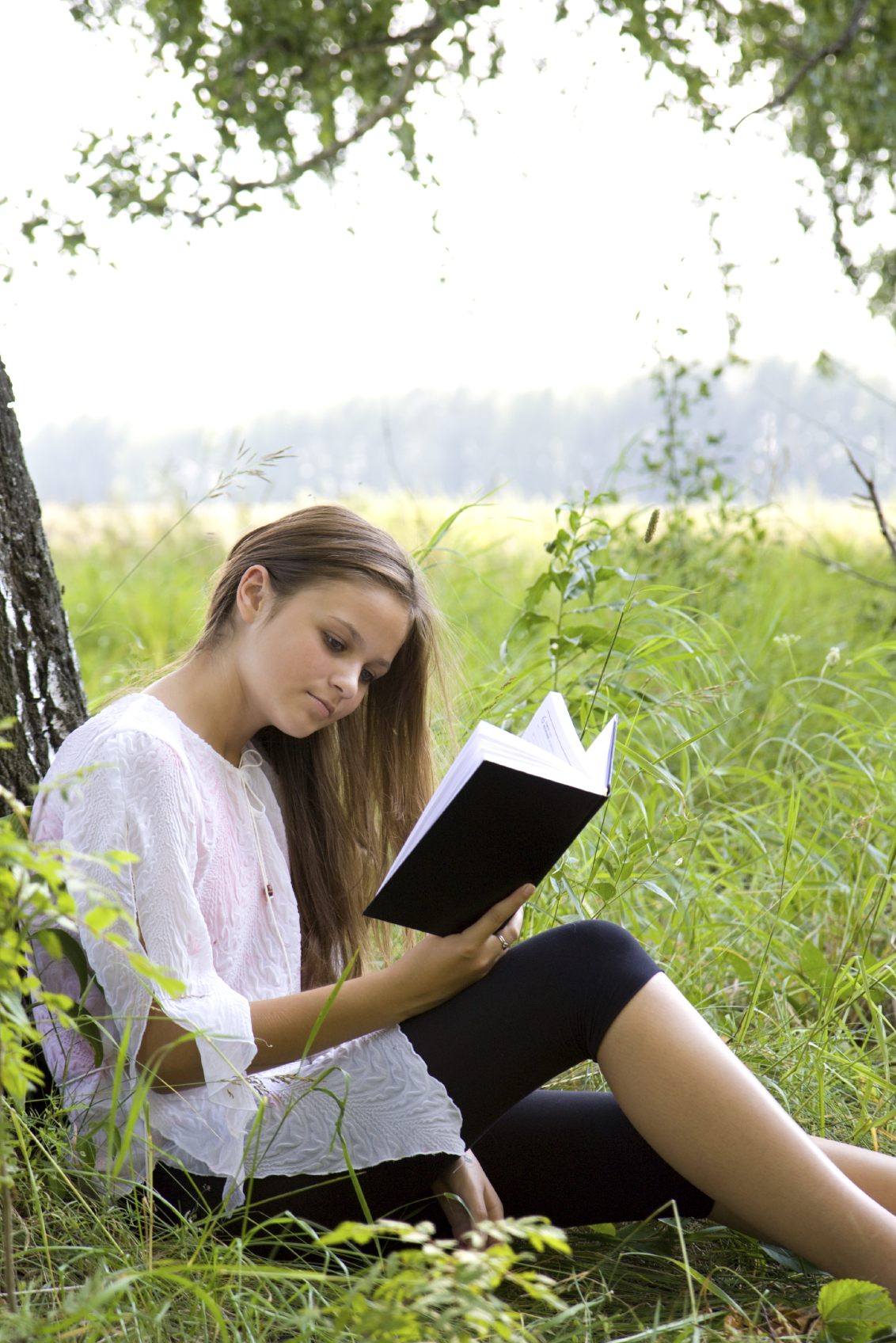 Young girl reading book in park in summer day