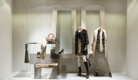 Boutique display window with mannequins in fashionable dresses