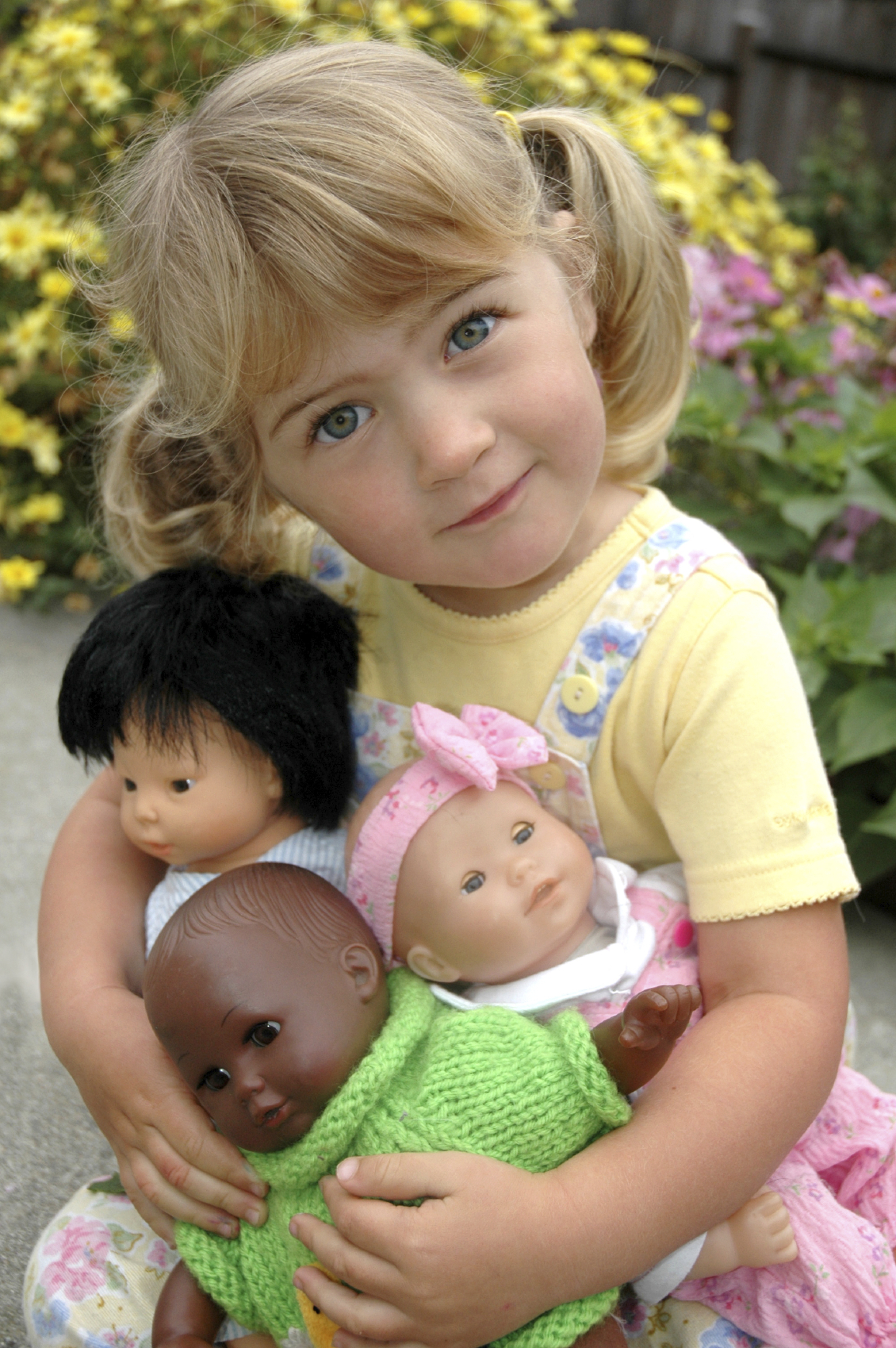 Three year old girl playing with Asian, African American and Caucasian dolls
