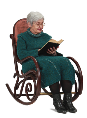 Old woman reading a black book while sitting in a rocker, isolated against a white background.