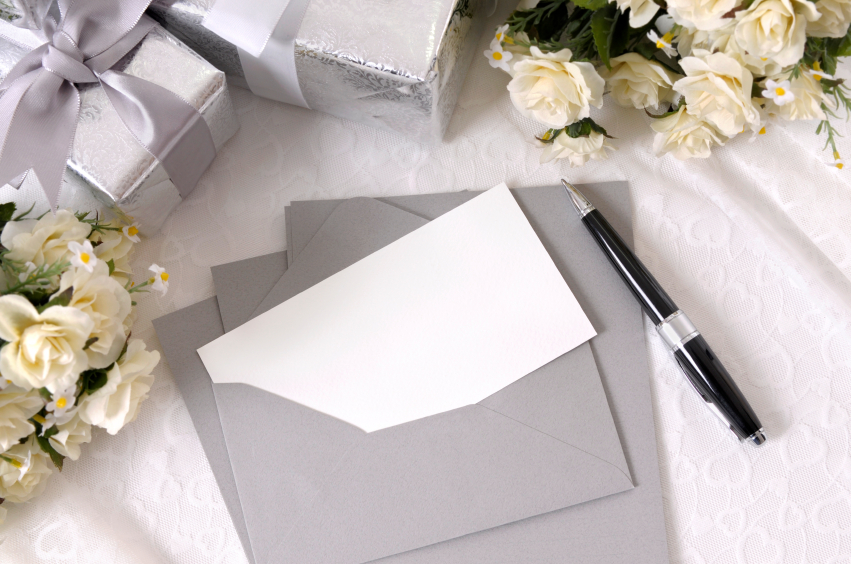 Writing paper or wedding invitation with envelope laid on bridal lace with several wedding gifts and white rose fabric bouquets.