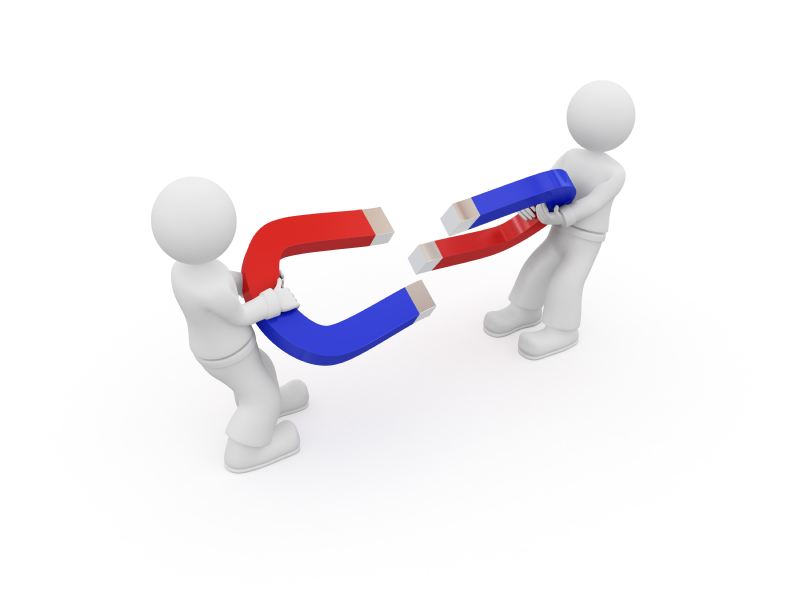 Two 3D characters try to overcome a magnetic attraction. Isolated on white background with soft shadows. XXXL 3D rendered image.
