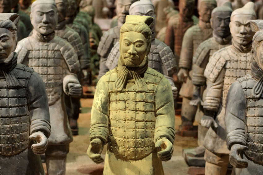 Chinese Qin warrior statues with one gold tinted in a crowd of grey.