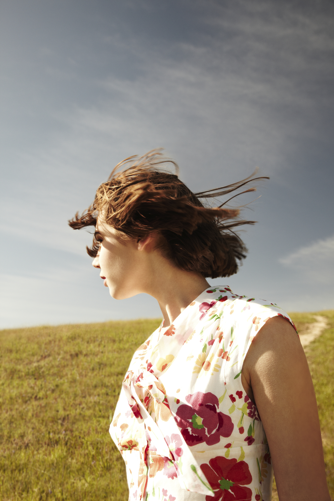 Beautiful woman in nature on green grass hill looking out at view with hair blowing in the wind