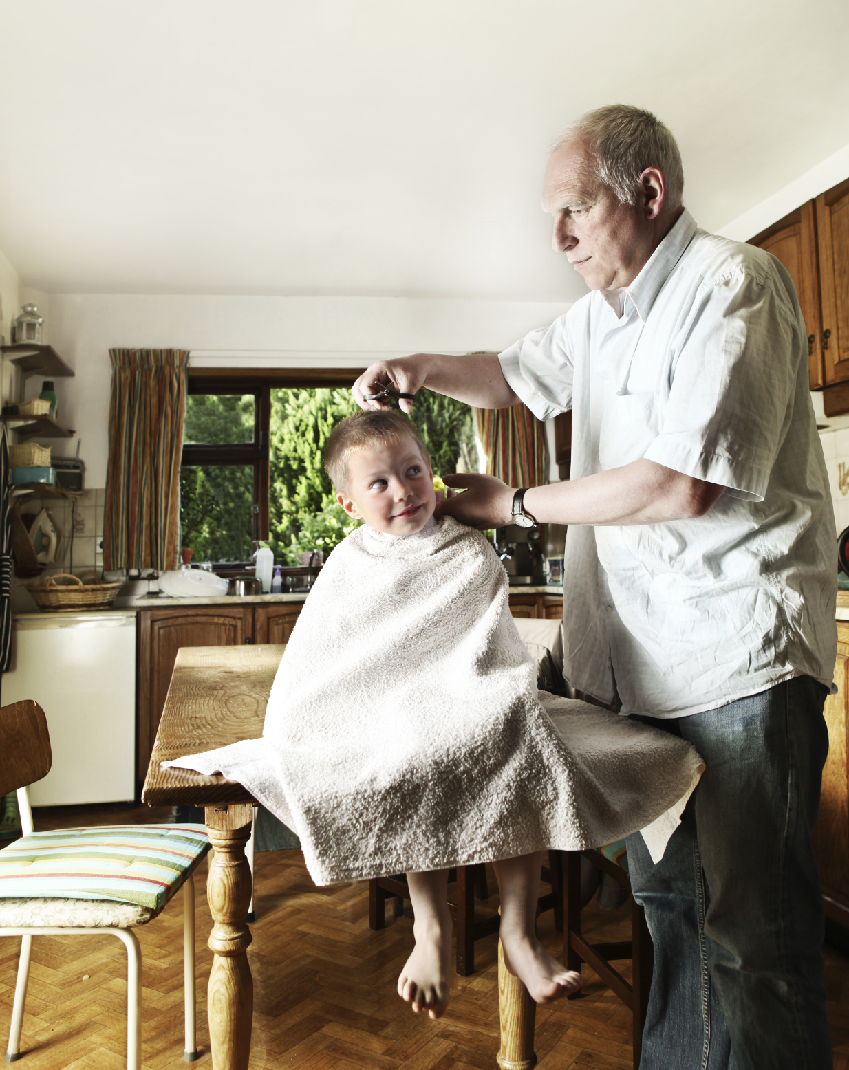 father cutting his son's hair in the kitchen