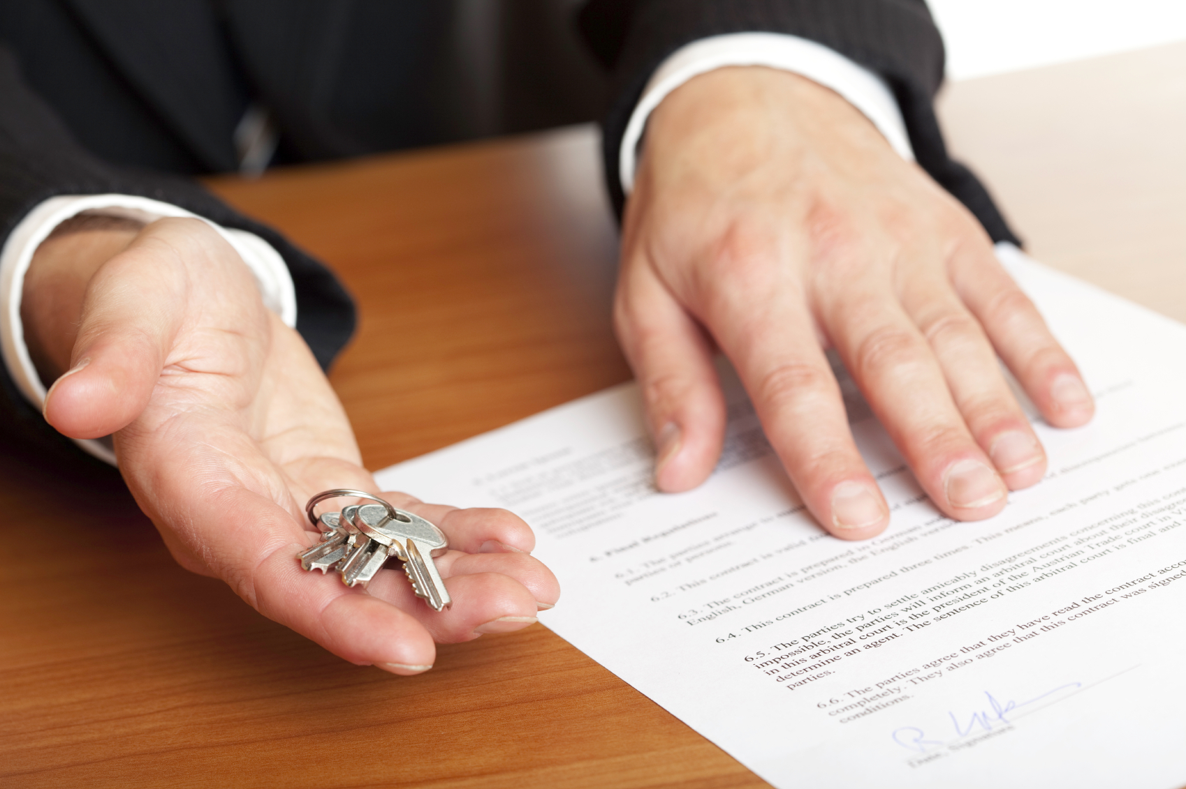 one hand of businessman gives house keys to the hand of another businessman. Signed contract and pen visible in background.