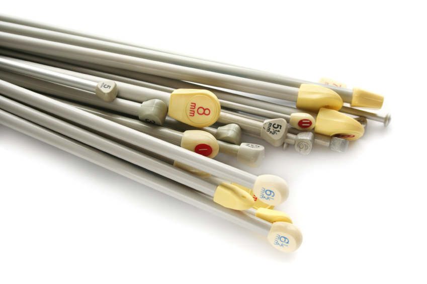 variety of knitting needles in different sizes - both European millimetres and UK sizes