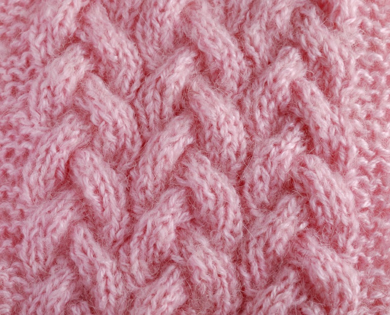 Pink jersey is made by hand. It is decorated with raised pattern and photographed closely.