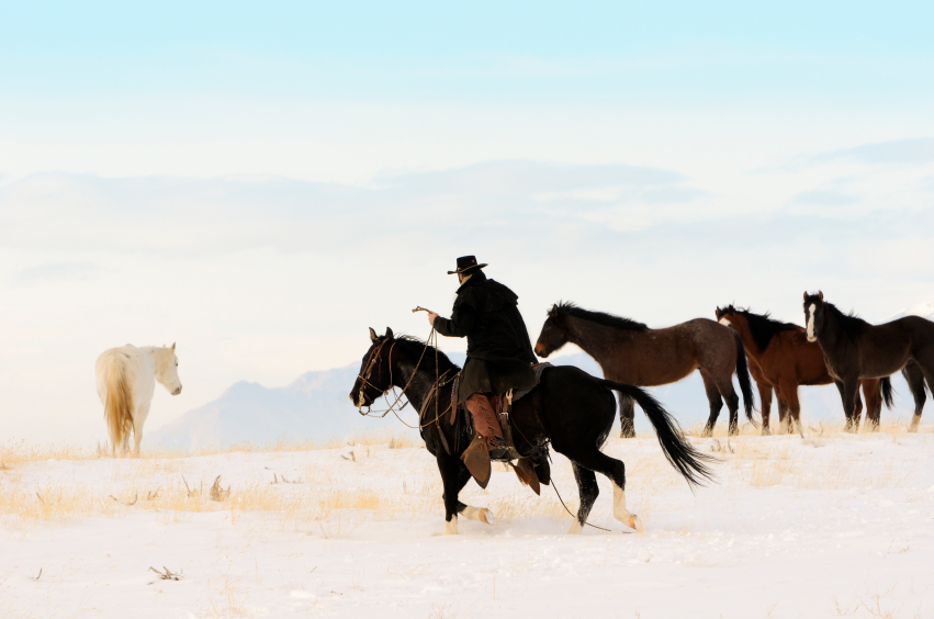 Lone cowboy rounding up a straggler from a herd of wild horses. Mountains in background. Wild West adventure. Copy Space.