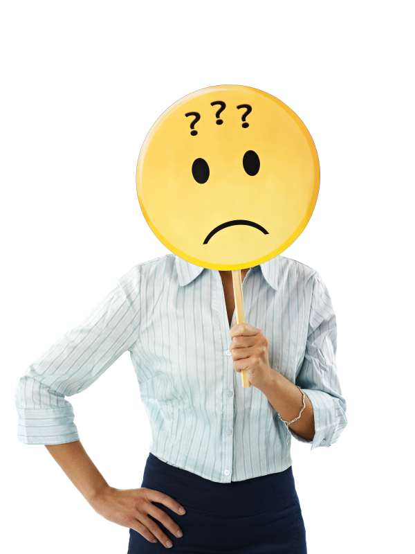 adult business woman holding emoticon with question marks on white background. Vertical shape, waist up