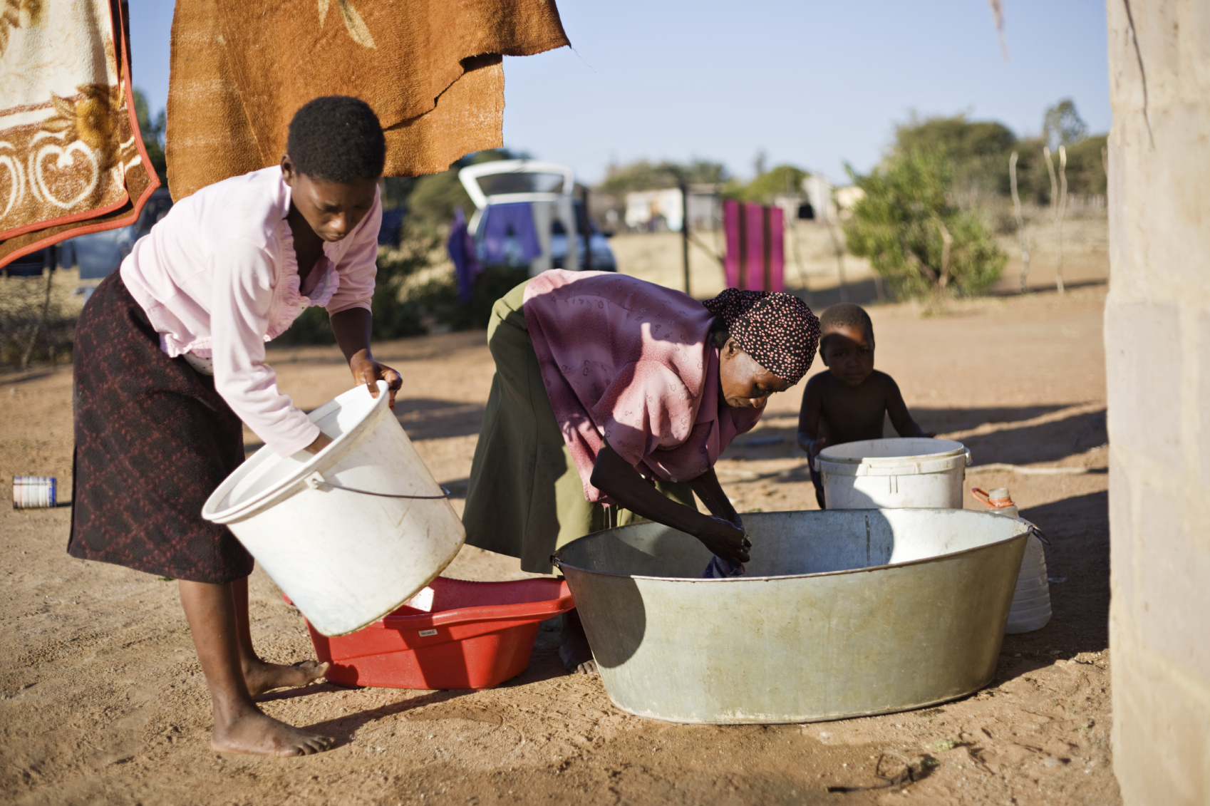 african woman in a poor community washing clothes in the backyard