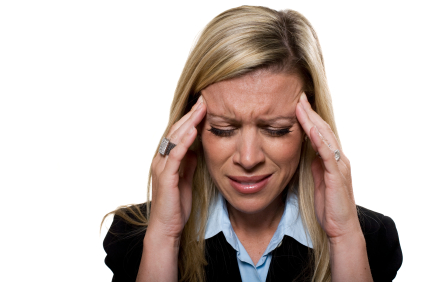 Businesswomen with a masive headache holding her hands to her temples.