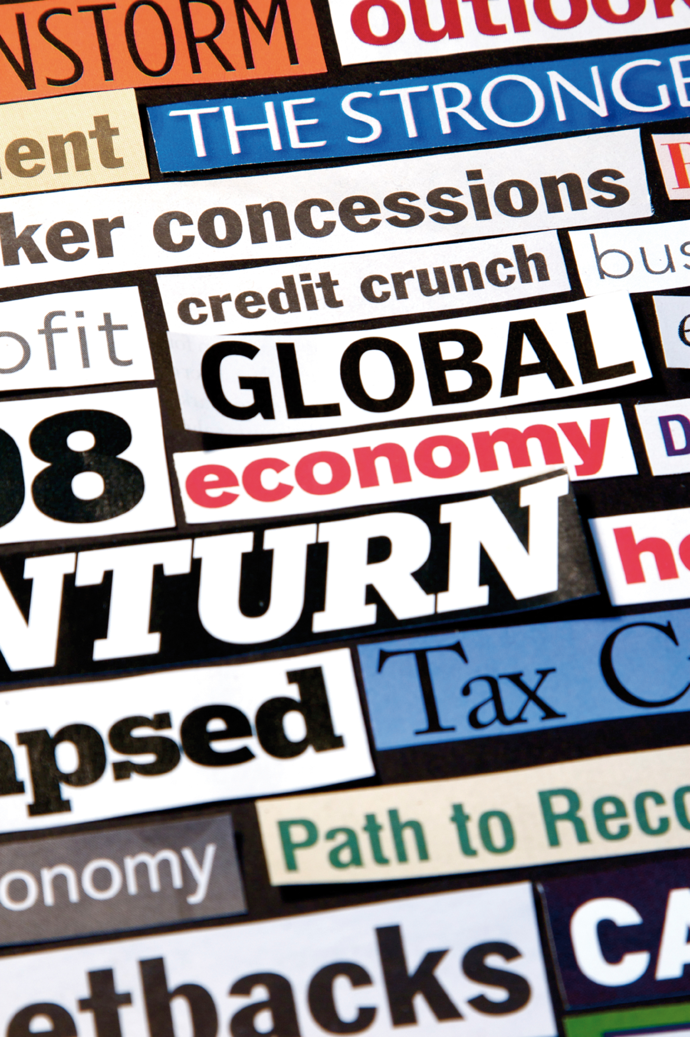 Newspaper and magazine headlines detailing the economic recession and recovery