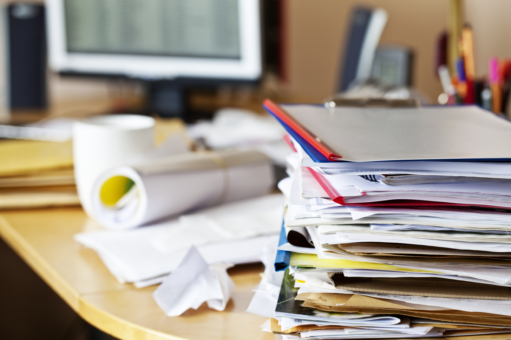 chaotic desk, covered with all kinds of paper, files and envelops