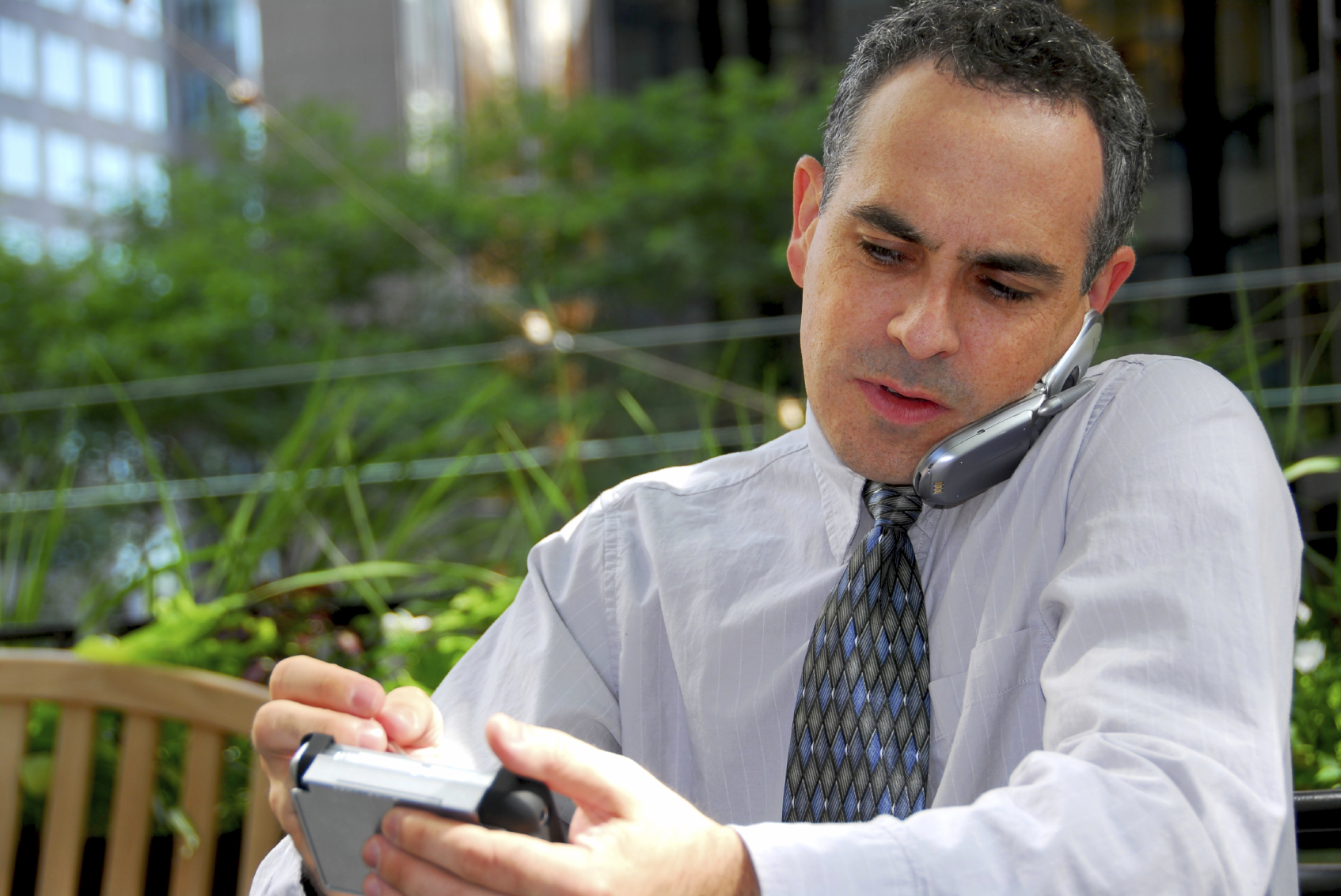 Portrait of a busy businessman in the city using pda and cell phone