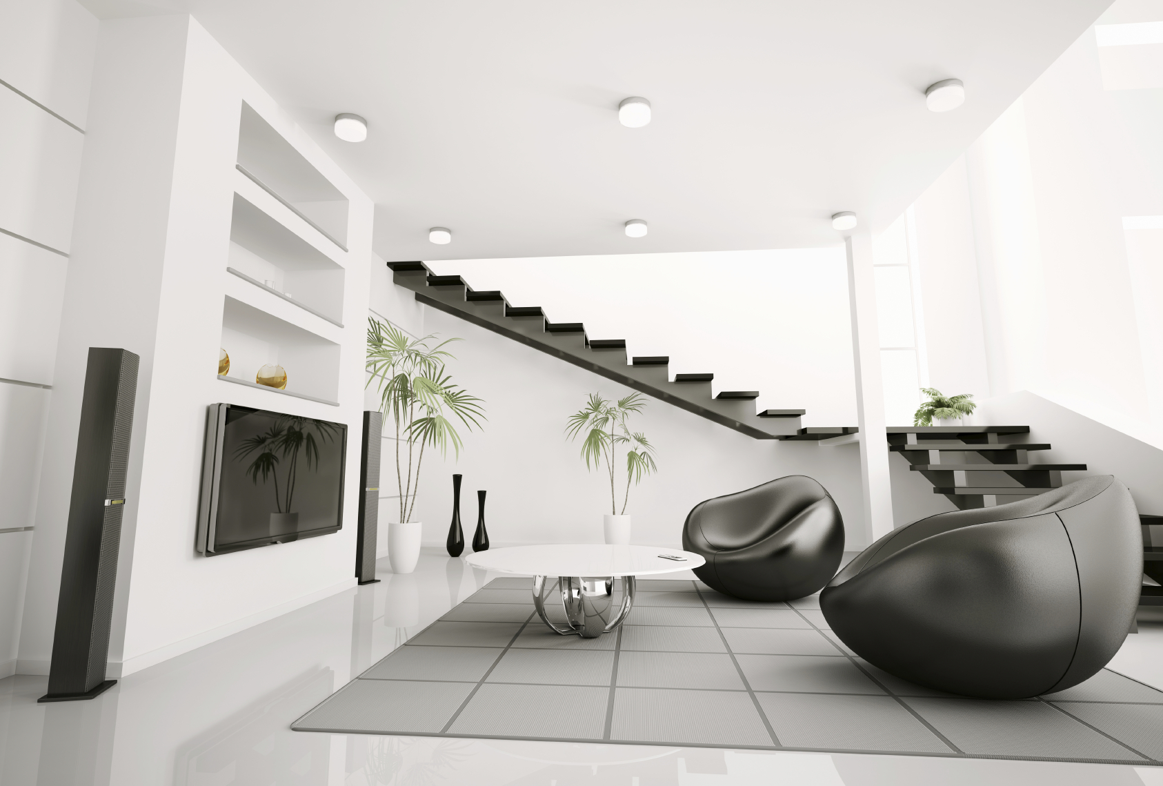 Living room interior black armchairs and lcd 3d render