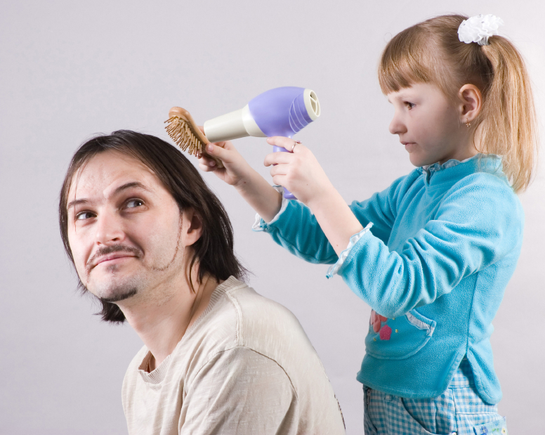 the little girl play at haidresser with father