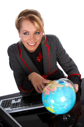 Lovely smiling pretty woman, travel agency officer showing destination on the globe
