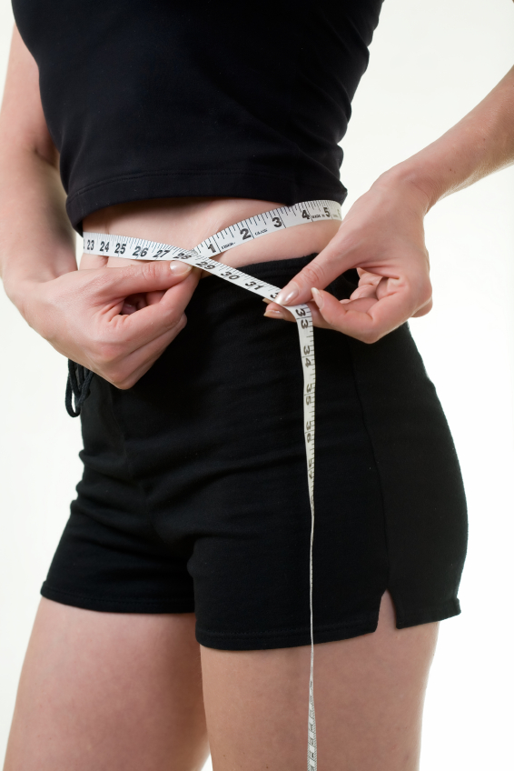 Attractive body of a woman in black shorts and workout top with a measuring tape around waist