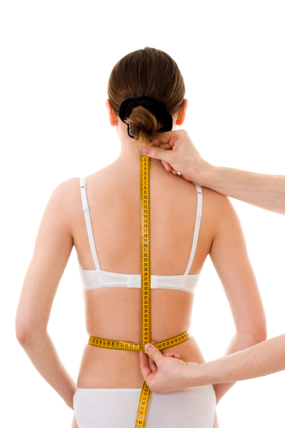 Measuring woman's back length, with centimetre isolated, in generic underclothing