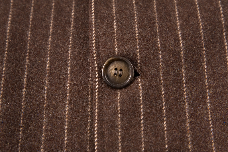 front view of classic striped fabric with close-up of brown button