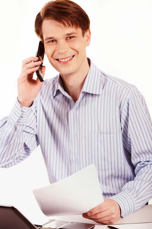 Portrait of young smiling businessman calling on his mobile and looking at camera