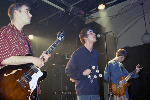 Oasis , left to right Paul 'bonehead ' Arthurs, Liam Gallagher and Noel Gallagher. Playing at a small club in Amsterdam, The Netherlands 1994